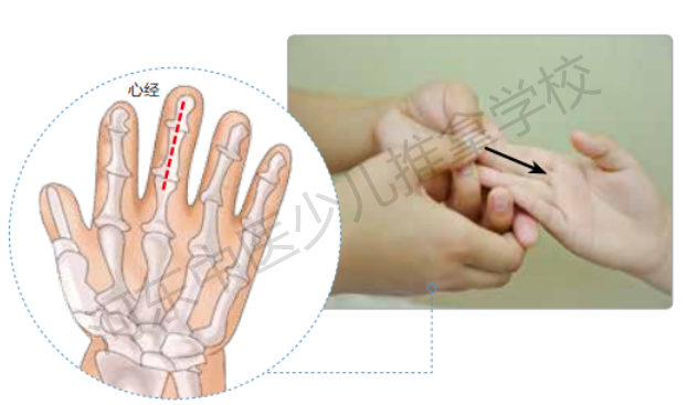 推拿方法:用拇指指腹从孩子中指尖向指根方向直推心经50~100次。