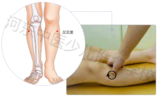 推拿方法:用拇指指端按揉孩子足三里穴30~50次,两侧可以同时进行。