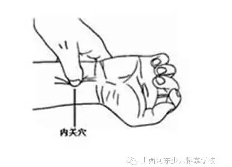 内关,意指心包经的体表经水由此注入体内。呕吐时,患者可用中指压内关穴来止呕,应压至有酸胀感为宜,约1分钟即止呕吐。